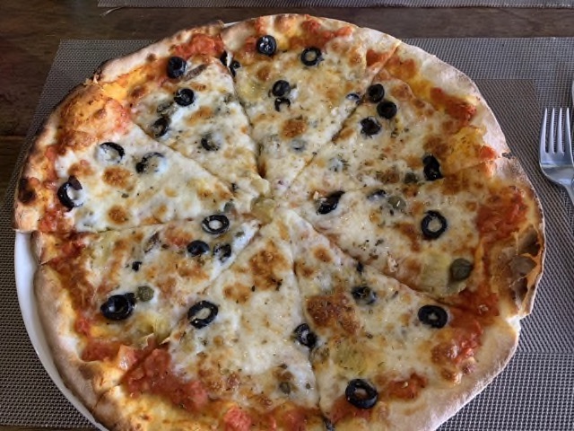 僕はピザを食べたが、妻はラザニアを食べていた。